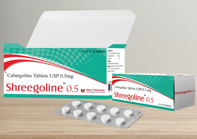 Shreegoline (Cabergoline) is used to treat hyperprolactinemia (high levels of prolactin, a natural substance that helps breast-feeding women produce milk but can cause symptoms such as infertility, sexual problems, and bone loss in women who are not breast-feeding or men). Shreegoline is in a class of medications called dopamine receptor agonists. It works by decreasing the amount of prolactin in the body.Excess production of prolactin hormone is due to unknown causes or abnormal growths in the pituitary. This medicine helps in preventing infertility, sexual problems, and bone loss caused by excess prolactin production in men and in women who are not breastfeeding. It is also used as a second line therapy in the treatment of signs and symptoms of Parkinson’s disease along with carbidopa-levodopa or as a single agent in case of failure of or intolerance to a non-ergot compound.